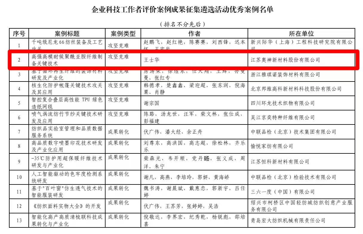 奧神新材“高強高模耐候聚酰亞胺纖維制備關鍵技術”入選中國科協《企業科技工作者評價案例庫》優秀案例